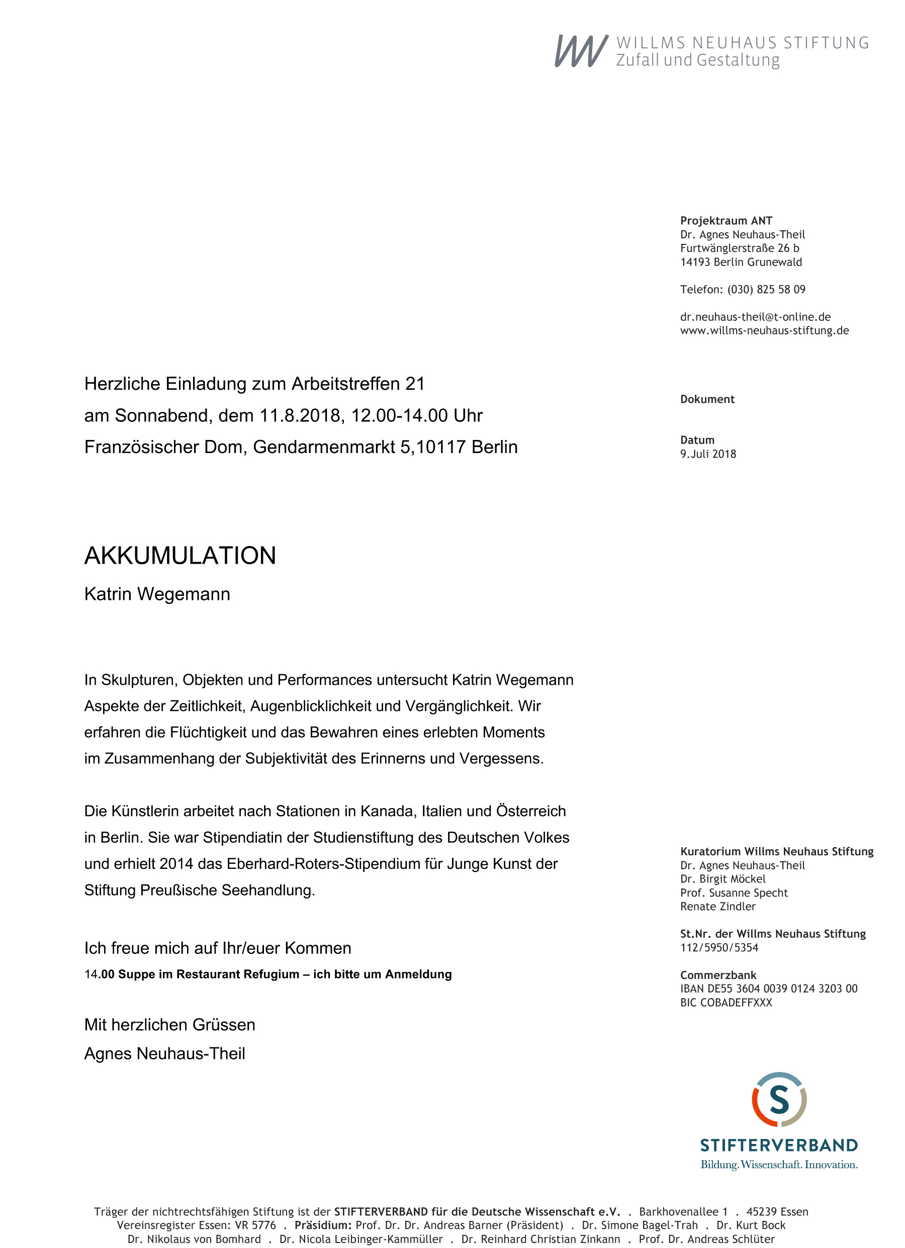 Akkumulation I Vortrag von Katrin Wegemann, bildende Künstlerin 11.08.2018 11-14 UhrArbeitstreffen 21 Französischer Dom, Gendarmenmarkt, 10117 Berlin