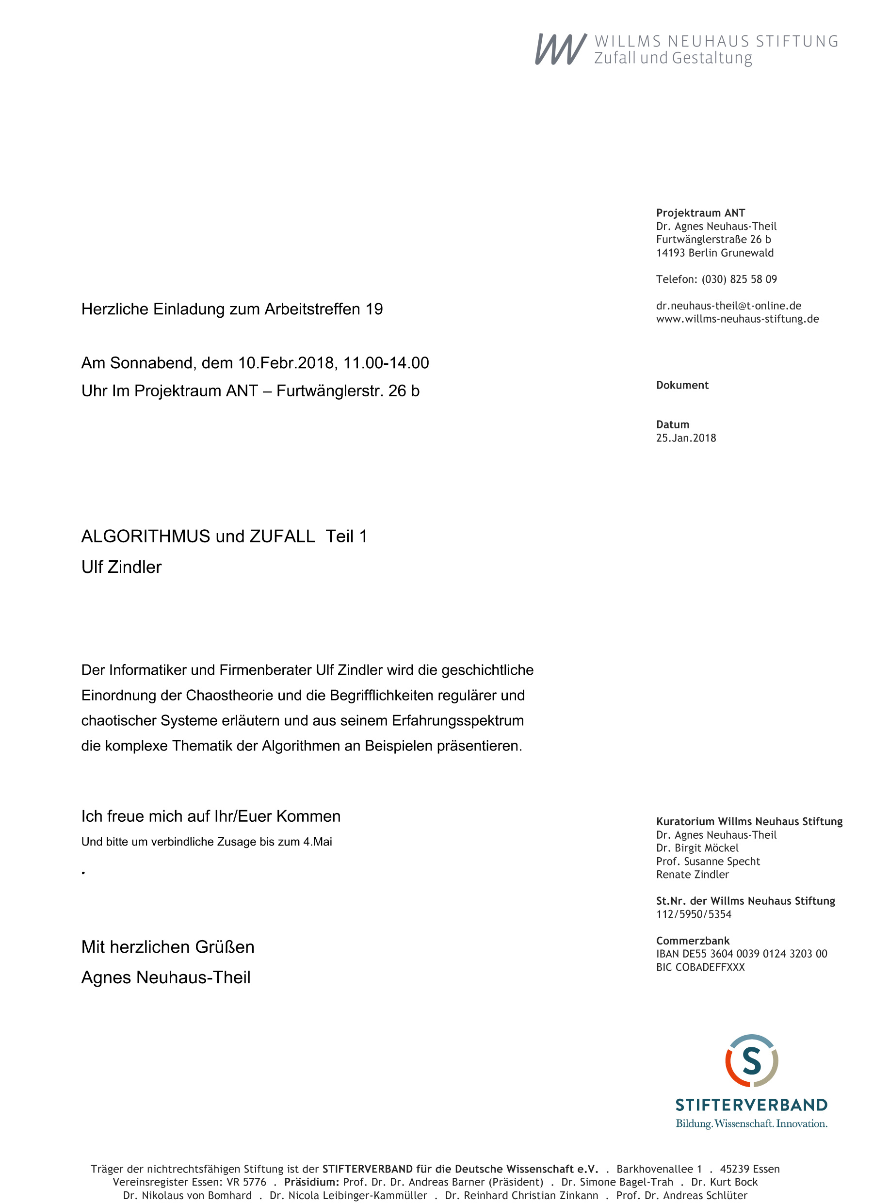 Algorithmus und Zufall, Teil I Vortrag von Ulf Zindler, Informatiker 10.02.2018 11-14 UhrArbeitstreffen 19 Projektraum ANT