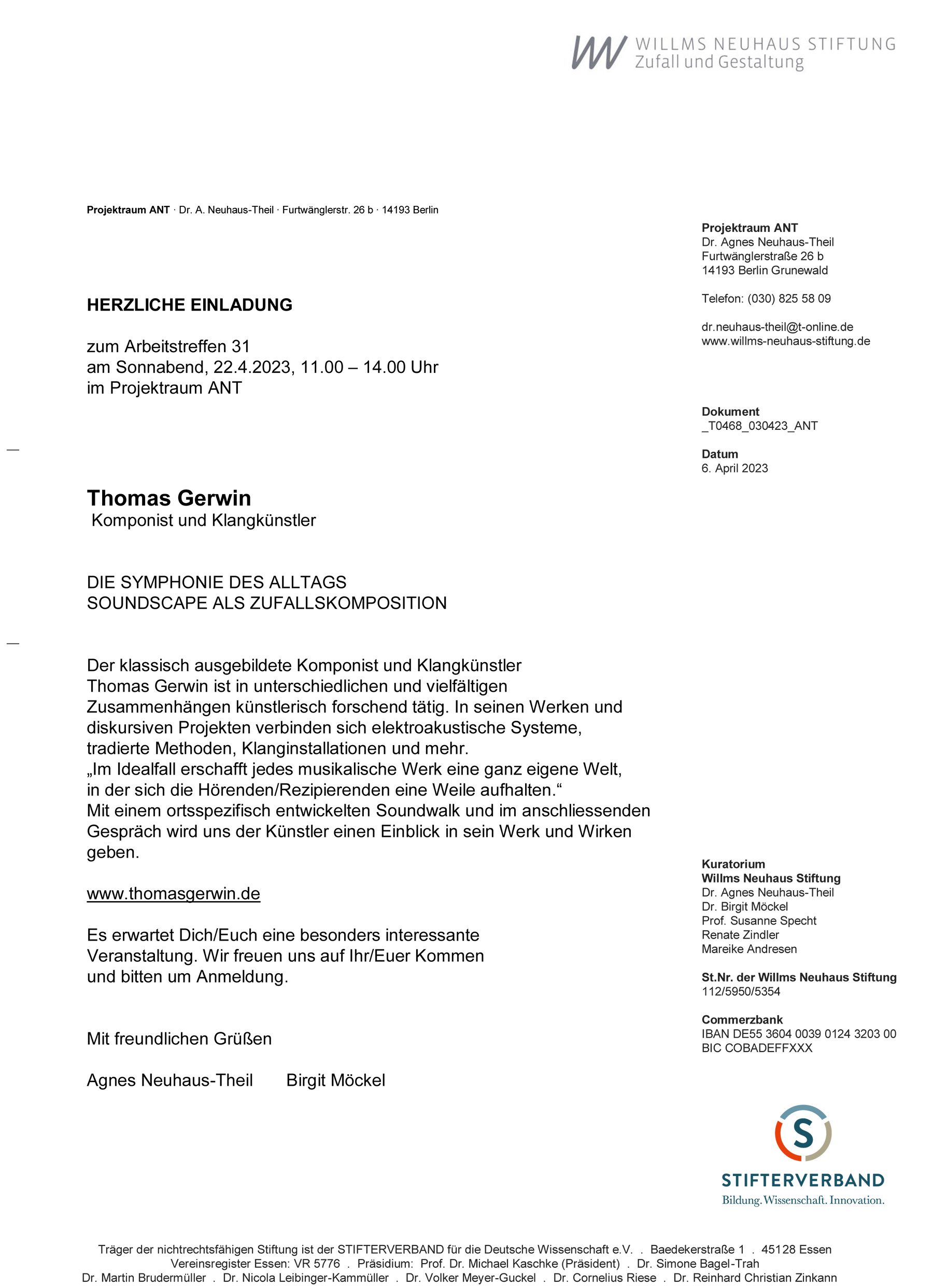 Die Symphonie des AlltagsSoundscape als Zufallskomposition Soundwalk und Gespräch mit Thomas Gerwin, Komponist und Klangkünstler 22.04.2023 11-14 UhrArbeitstreffen 31 Projektraum ANT