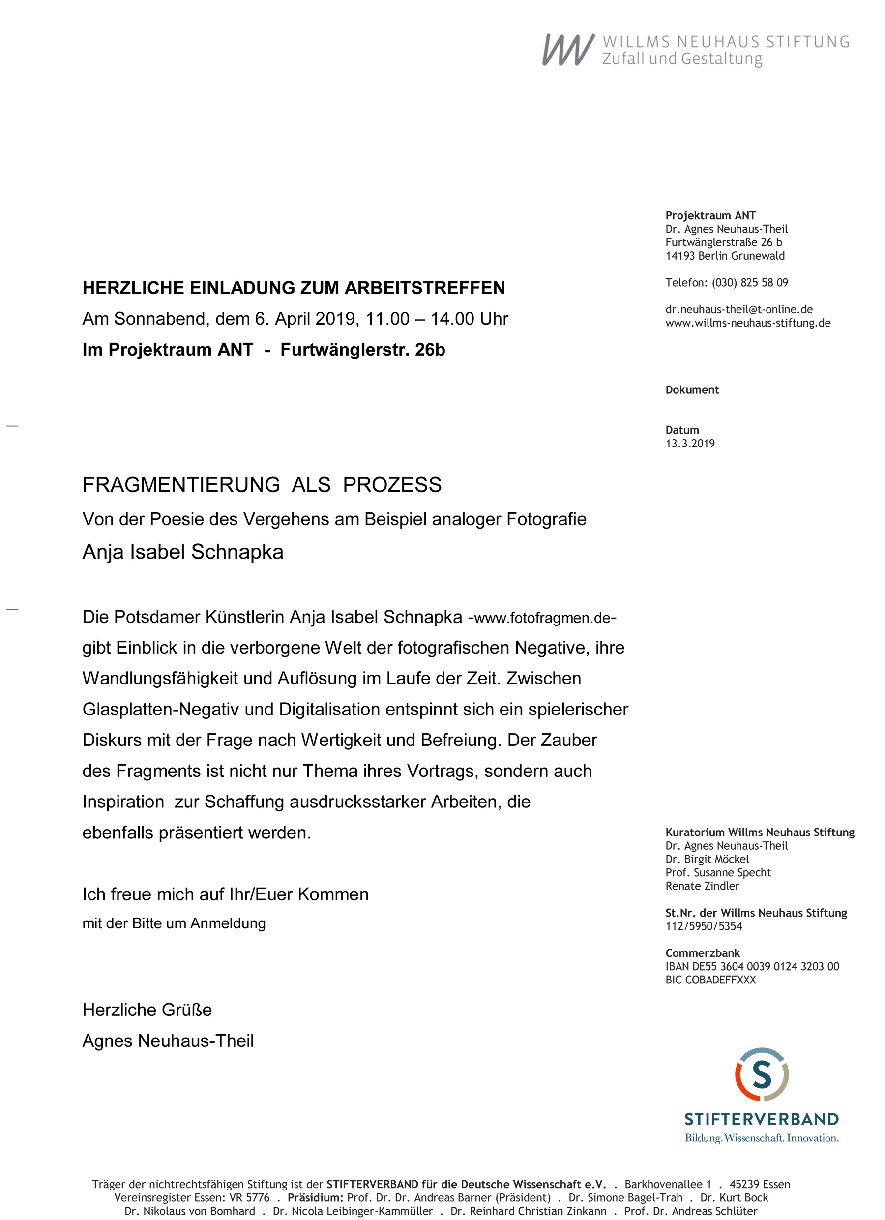Fragmentierung als ProzessVon der Poesie des Vergehens am Beispiel analoger Fotografie Vortrag von Anja Isabel Schnapka, bildende Künstlerin 06.04.2019 11-14 UhrArbeitstreffen 24 Projektraum ANT