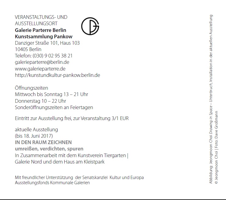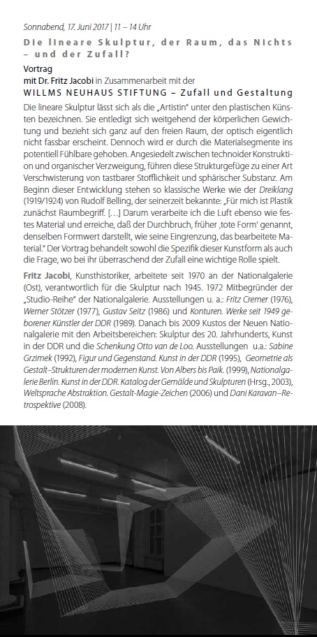 In den Raum zeichnen umreißen – verdichten – spuren Ein Kooperationsprojekt über lineare Skulptur in BerlinKuratorinnen: Claudia Busching und Pomona Zipser, bildende KünstlerinnenVortrag von Dr. Fritz Jacobi, Kunstwissenschaftler Weitere Informationen finden Sie beim Arbeitstreffen 17: Die lineare Skulptur, der Raum, das Nichts – und der Zufall?