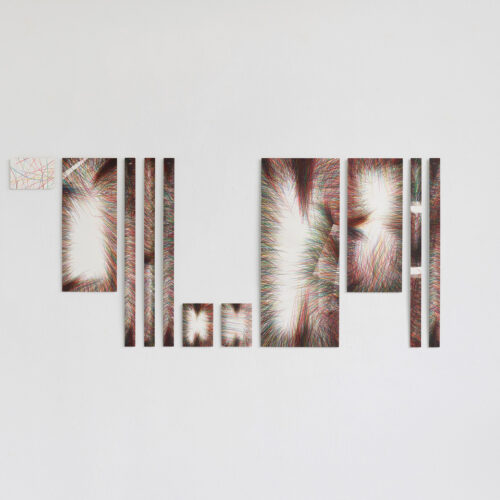 Ausstellungsansicht im T66, Über den Rand 5B 2024, Buntstifte auf Papier, 201 x 163 cm, (Außenmaße variabel) 16,8 x 11,5 cm (kleinste), 72,2 x 29,9 cm (größte),