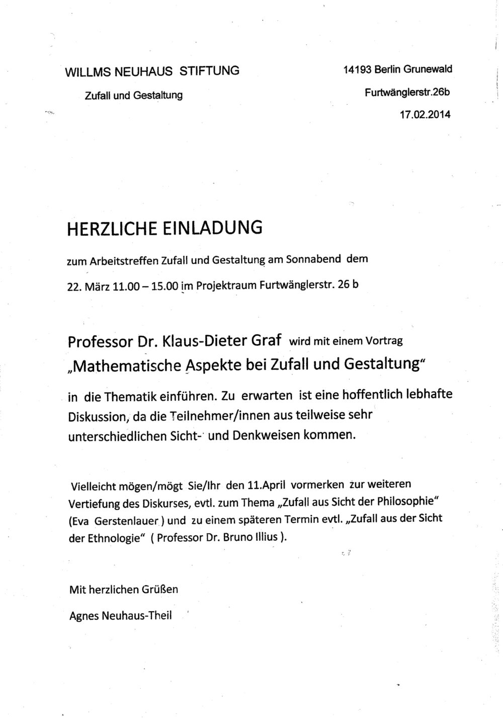 Mathematische Aspekte bei Zufall und Gestaltung Vortrag von Prof. Dr. Klaus–Dieter Graf, Mathematiker 22.03.2014 11-14 UhrArbeitstreffen 1 Projektraum ANT