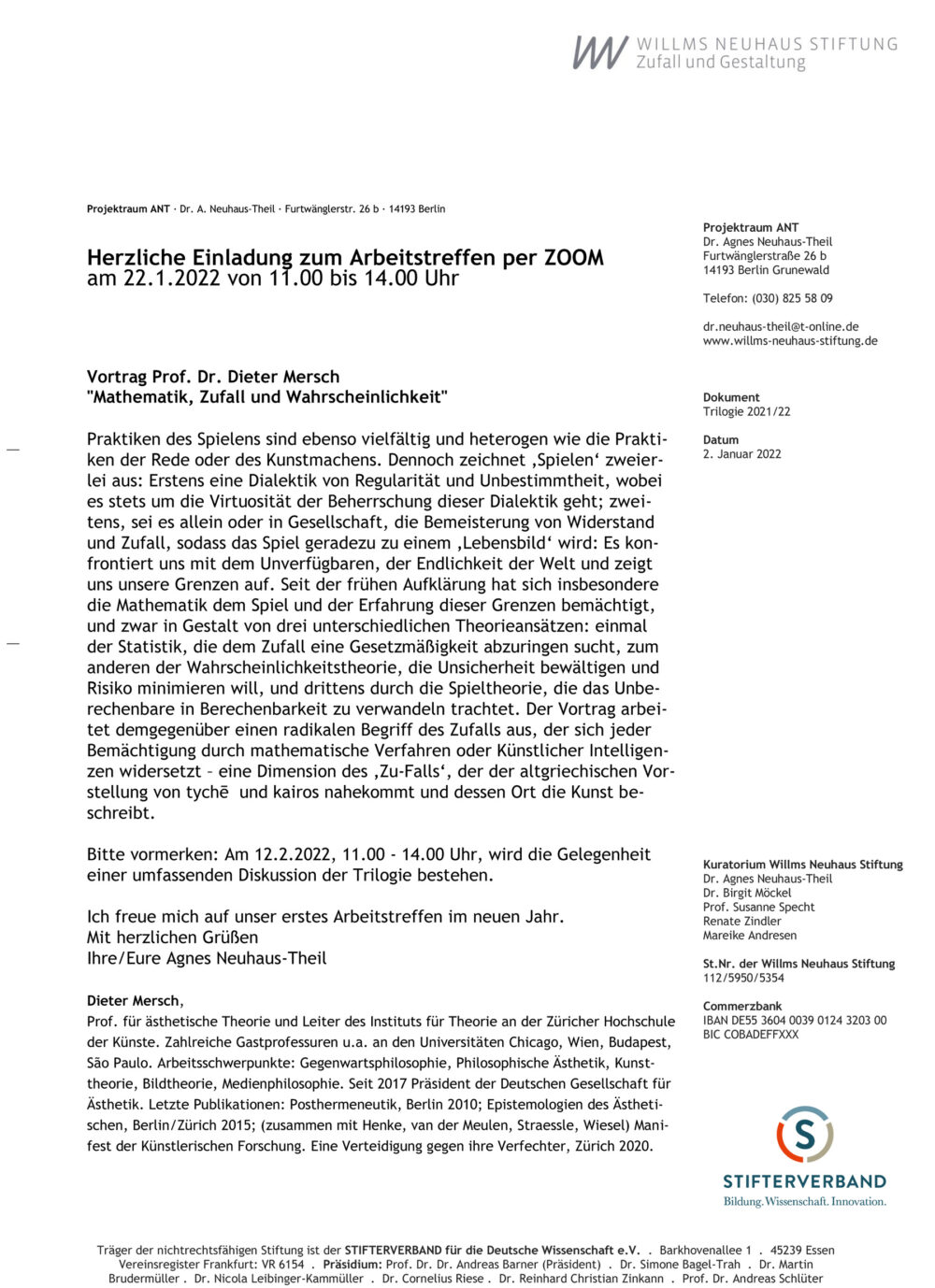 Tetralogie 3: Mathematik, Zufall und Wahrscheinlichkeit Vortrag von Prof. Dr. Dieter Mersch, Medienwissenschaftler und Autor 22.01.2022 11-14 UhrArbeitstreffen 27/II online
