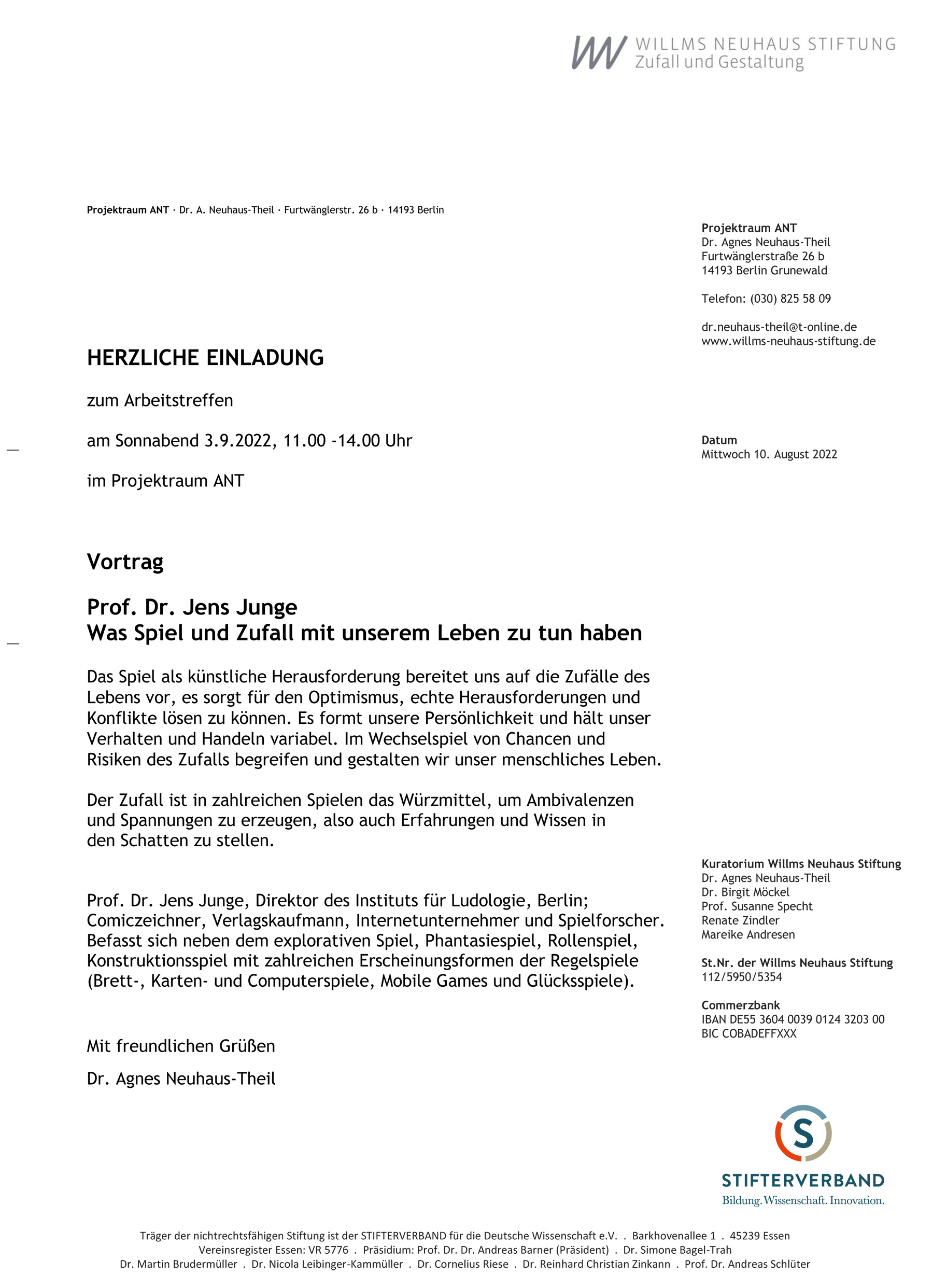 Was Spiel und Zufall mit unserem Leben zu tun hat Prof. Dr. Jens Junge, Spielforscher 03.09.2022 11-14 UhrArbeitstreffen 29 Projektraum ANT