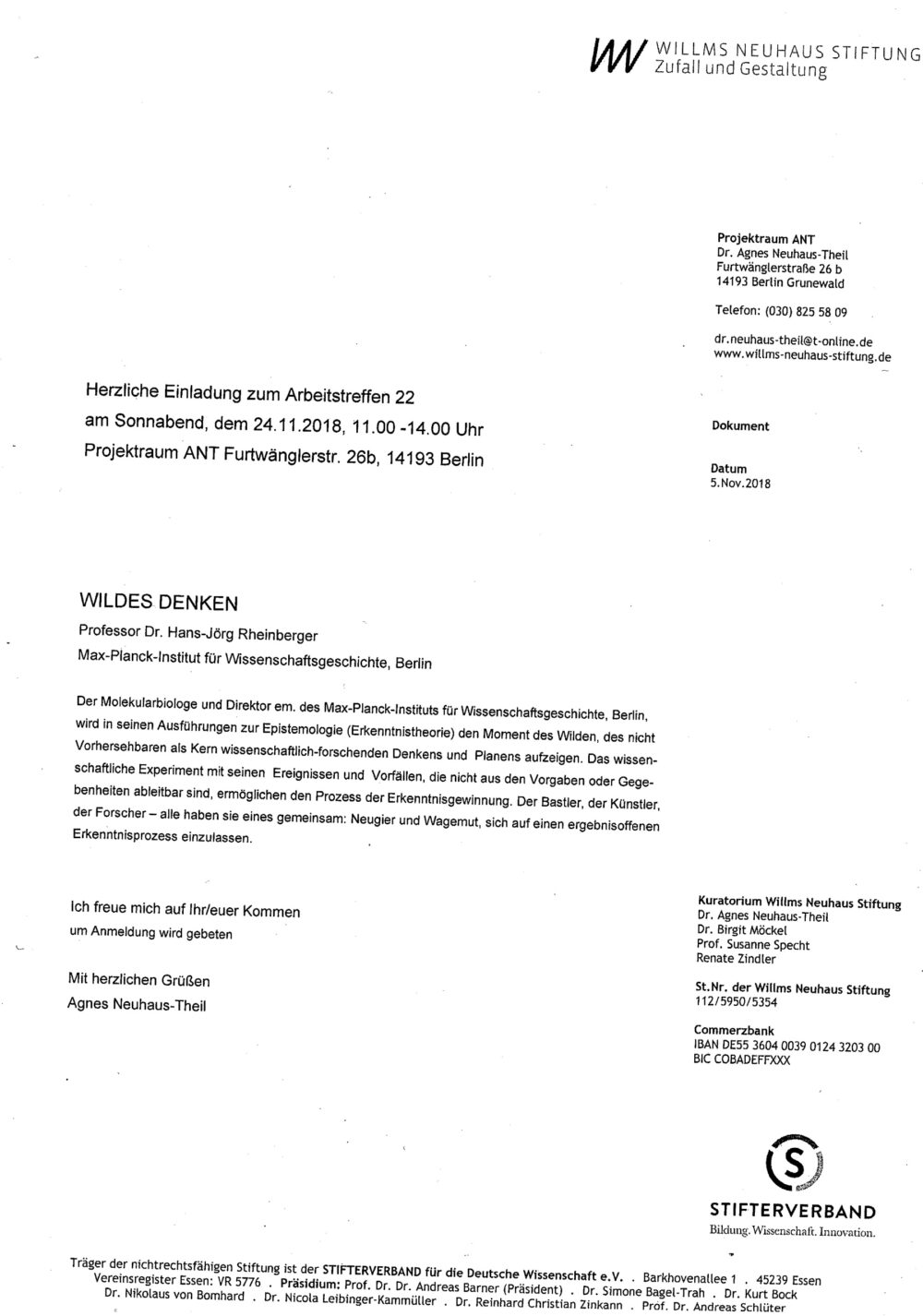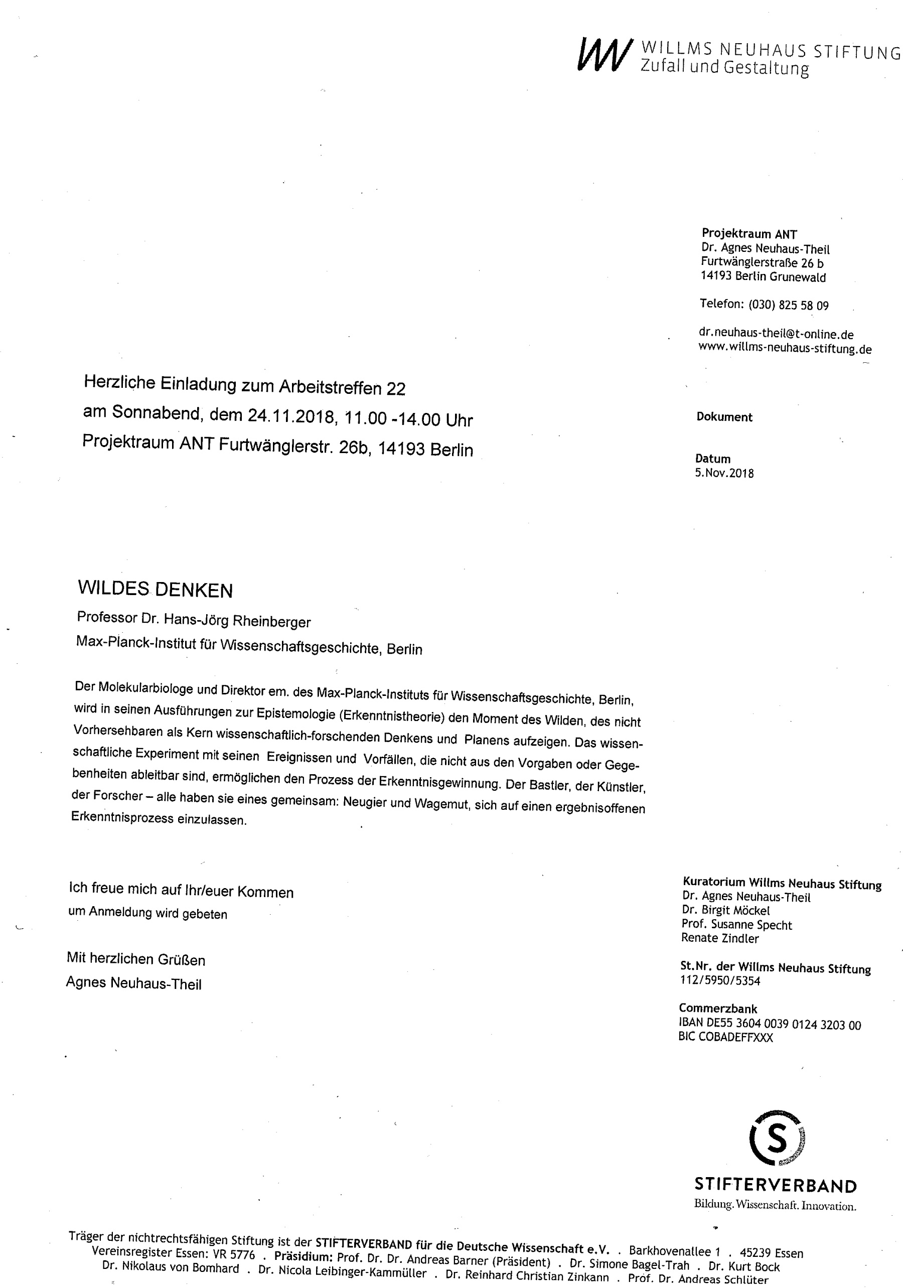 Wildes Denken Vortrag von Prof. Dr. Hans-Jörg Rheinberger, Molekularbiologe und Wissenschaftshistoriker 24.11.2018 11-14 UhrArbeitstreffen 23 Projektraum ANT
