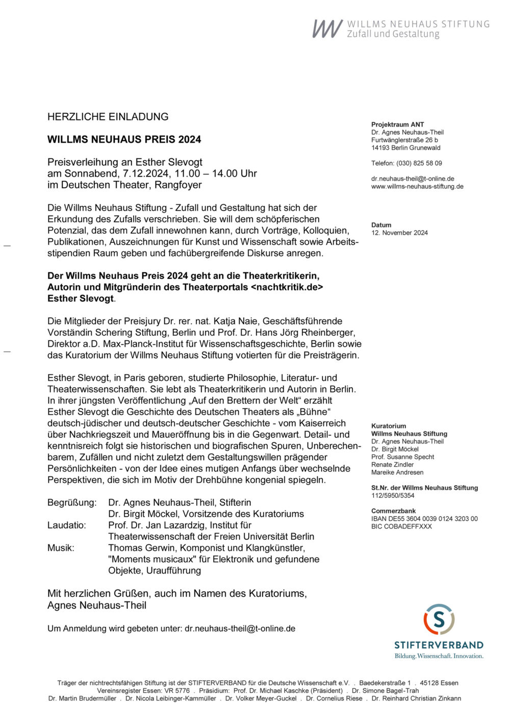 Esther Slevogt arbeitet als Autorin und Theaterkritikerin. Sie ist Chefredakteurin des Theatermagazins <nachtkritik.de>, das sie 2007 mitgegründet hat. In Paris geboren studierte sie Philosophie, Literatur- und Theaterwissenschaft. Unter ihren zahlreichen Publikationen ist die Wolfgang-Langhoff-Biografie „Den Kommunismus mir der Seele suchen“, 2011 im Verlag Kiepenheuer & Witsch erschienen. 2023 erschien im Ch. Links Verlag ihr Buch „Auf den Brettern der Welt“ über das Deutsche Theater in Berlin. 2024 wurde sie mit dem Willms Neuhaus Preis ausgezeichnet.
