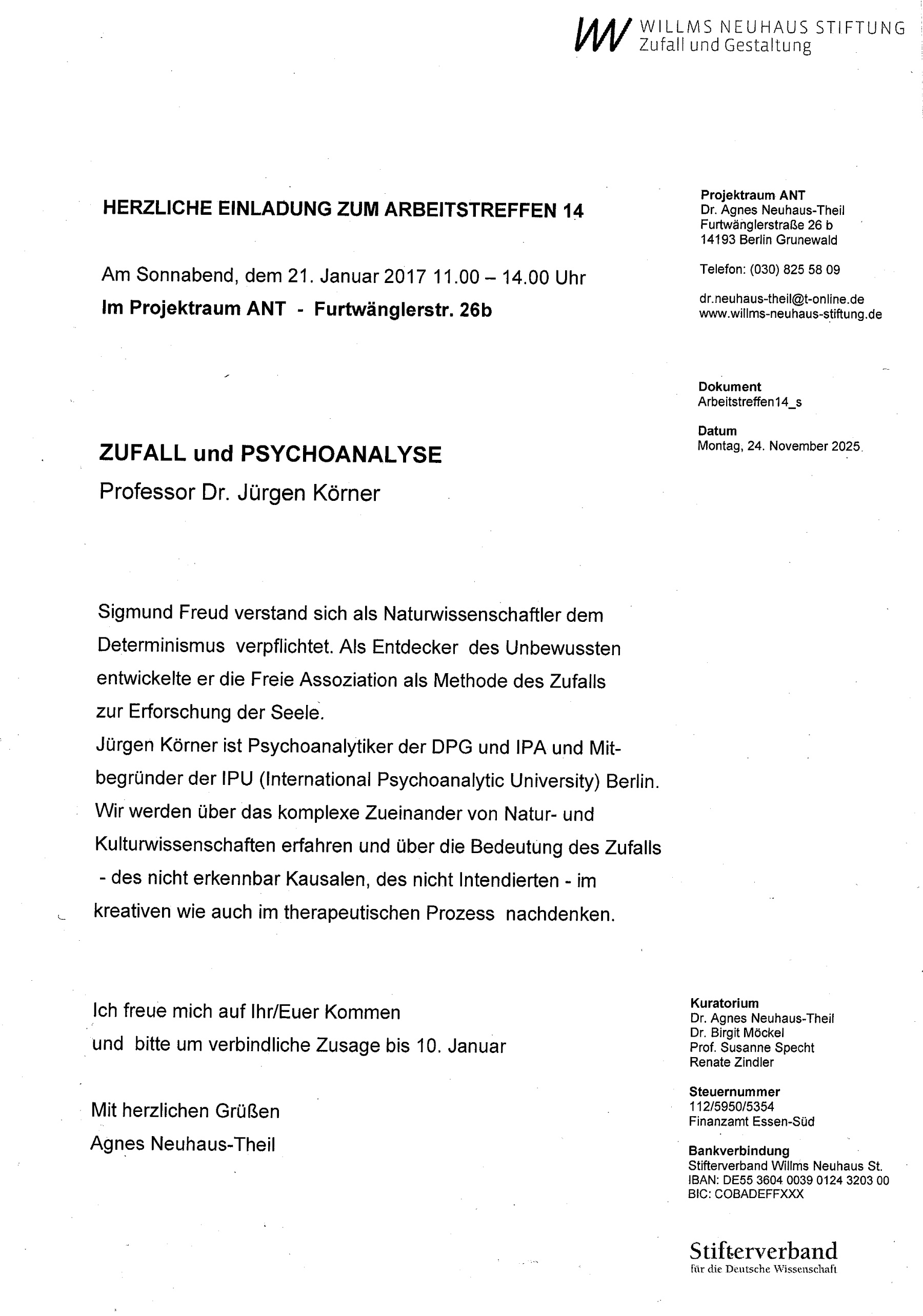 Zufall und Psychoanalyse Vortrag von Prof. Dr. Jürgen Körner, Psychoanalytiker 21.01.2017 11-14 UhrArbeitstreffen 14 Projektraum ANT