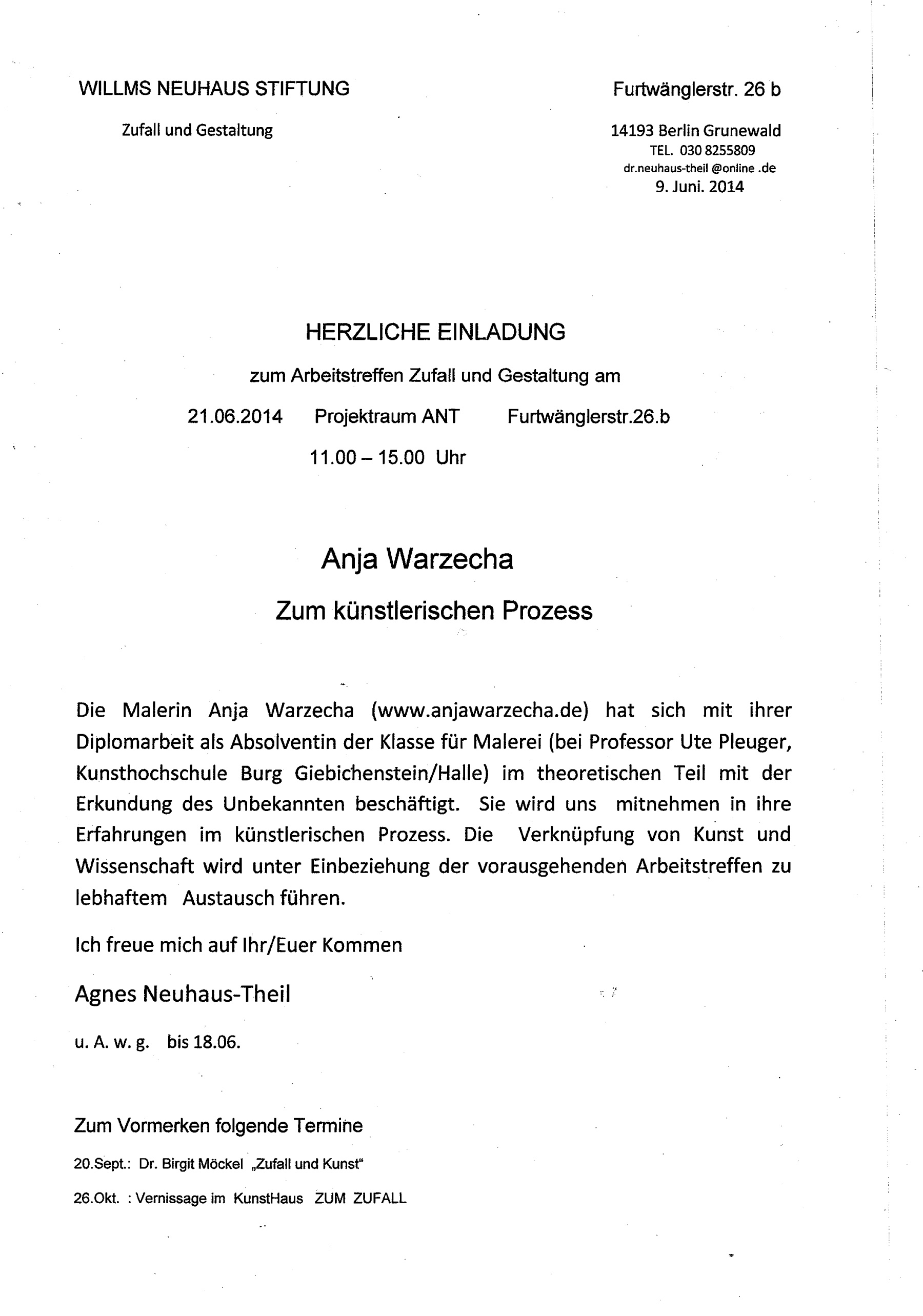Zum künstlerischen Prozess Vortrag von Anja Warzecha, bildende Künstlerin 21.06.2014 11-14 UhrArbeitstreffen 4 Projektraum ANT