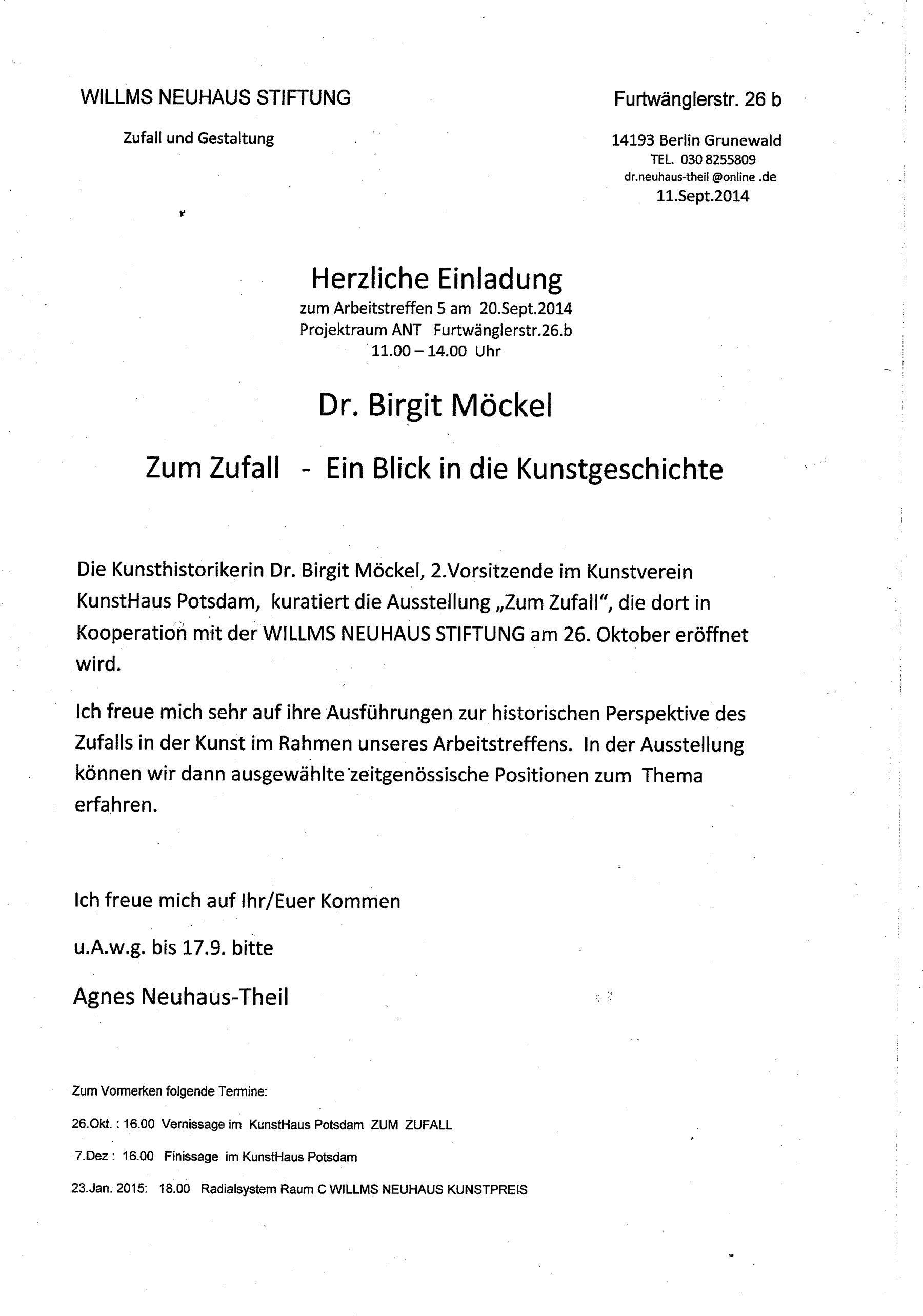 Zum Zufall – Ein Blick in die Kunstgeschichte Vortrag von Dr. Birgit Möckel, Kunsthistorikerinim Rahmen der Ausstellung <Zum Zufall> 20.09.2014 11-14 UhrArbeitstreffen 5 Projektraum ANT